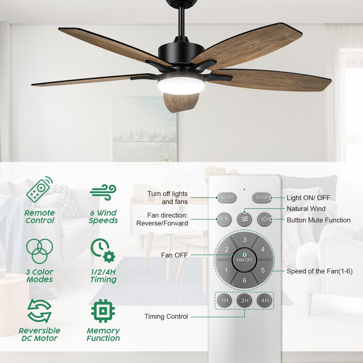 • LED Light with Three Color Temperatures – This living room ceiling fan features a 16W LED light that provides three color temperature options: cool white, daylight, and warm yellow, catering to various life scenarios. Additionally, LED lights offer enhanced brightness and energy efficiency compared to incandescent and fluorescent light sources.